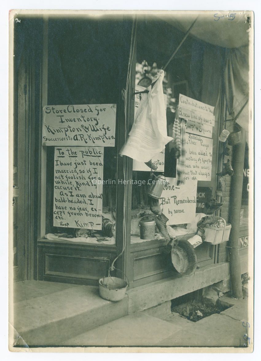 Black and white photograph of Kimpton's Jewelry Store in Oberlin, Ohio. There are many hand painted signs in the window. One sign says "Store closed for inventory. Kimpton and Wife. Successors to A.R. Kimpton." Another reads "To the public, I have just been married, so if I act foolish for a while, kindly excuse it. As I am already bald headed, I have no fear except from brooms etc." There are also other humorous messages to the public and pans, baskets, and drinking mugs hanging outside the window.Photograph Details