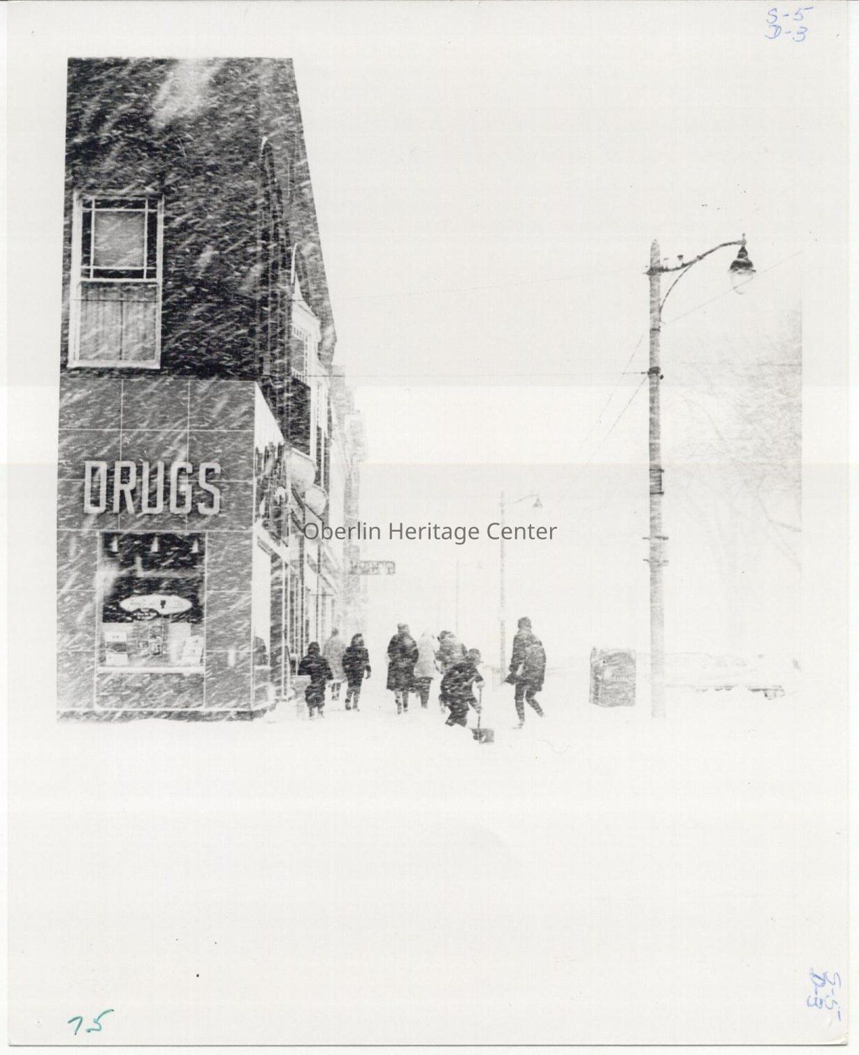 Black and white photograph of a Main and West College street during a snow storm. There is a drug store on the street corner. Some people in coats are walking along the street, one person is holding a shovel. There is also a lamp post on the left of the sidewalk. A mailbox is partially buried by snow on the side of the street.Photograph Details