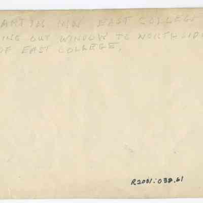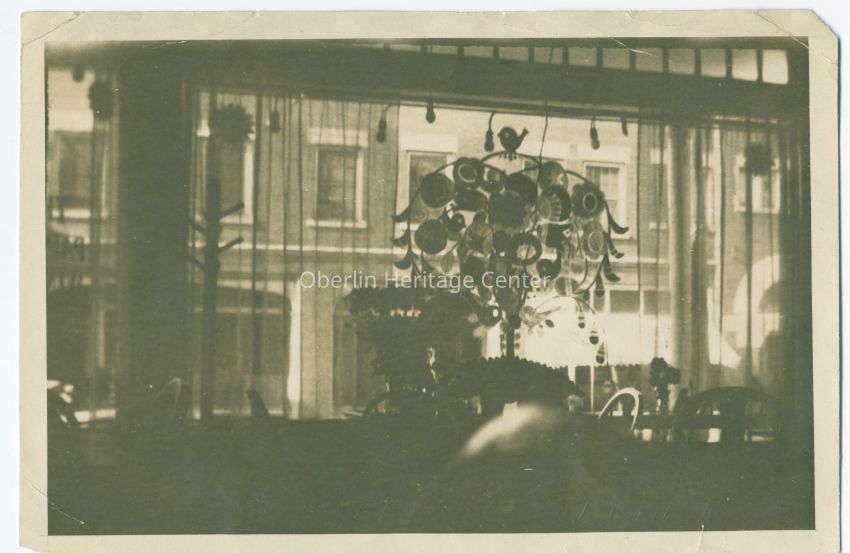 Black and white photograph of the inside of Martin Inn looking out onto the north side of East College Street. Sheer curtains partially cover either side of the window. There is a coat tree by the window. There are multiple chairs and tables occupying the room. In the middle of one of the tables is decorative, peacock-like fixture. A small decorative bird is perched at the top of it.Photograph Details