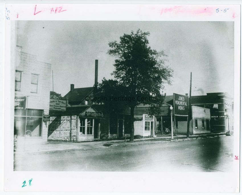 Black and white photograph of multiple store fronts on South Main Street. These stores include: Oberlin Top Body Shop, Morgan Coal and Ice, Jones Monumental Works, and the Oberlin Laundry. There are multiple telegraph/telephone poles as well as trees with leaves. The road is paved.