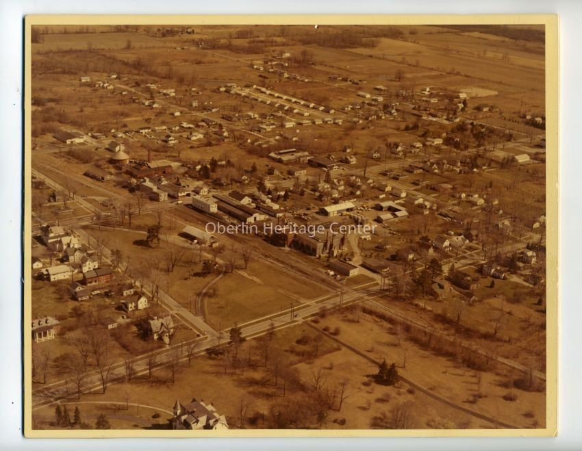 One color photographic print of an aerial view of the South Professor and South Main Street area including the Depot Park, Service building, and the Electric Building. Most of the city of Oberlin is visible.Photograph Details
