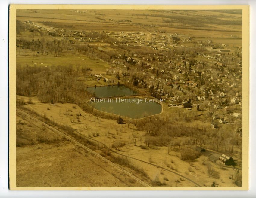 One color photographic print of an aerial view on the Old Water Works and reservoir in Oberlin. Railroad tracks run along the bottom of the scene and much of the city of Oberlin is visible.Photograph Details