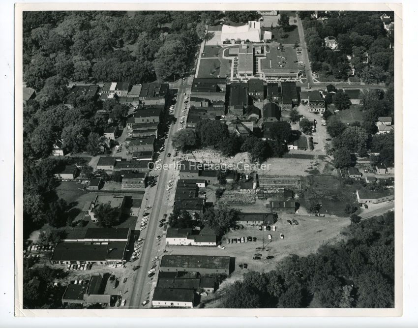 One black and white photographic print of the South Main Street area of Oberlin. Several other city streets are visible as well. Notable buildings visible include the Vineway Building, the Post Office, Westervelt, the Oberlin Inn, and Hall Auditorium.Photograph Details