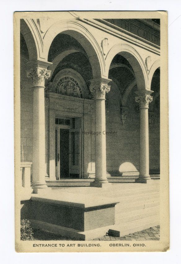 One black and white photographic postcard of the entrance to the Allen Art building on the Oberlin College campus. The back of the postcard is blank.Photograph Details