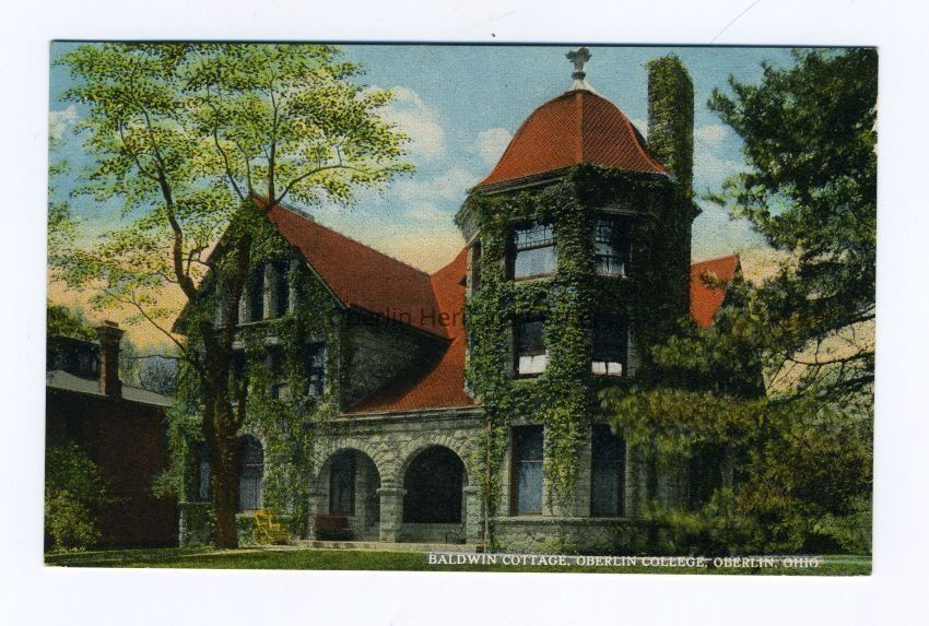 One color photographic postcard of the Baldwin Cottage on the Oberlin College campus. The building is covered with vines and a building stands to the left of it. The back of the postcard is blank.Photograph Details