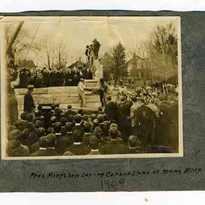 Two black and white photographic prints, the first being of a group of men and women dressed in costume, gathered in front of a Christmas tree. The caption reads: "Xmas 1910." The second print is of a group of people watching men lay cornerstone on a stone foundation. People stand surrounding the entire structure. Several buildings stand in the background to the right.Photograph Details