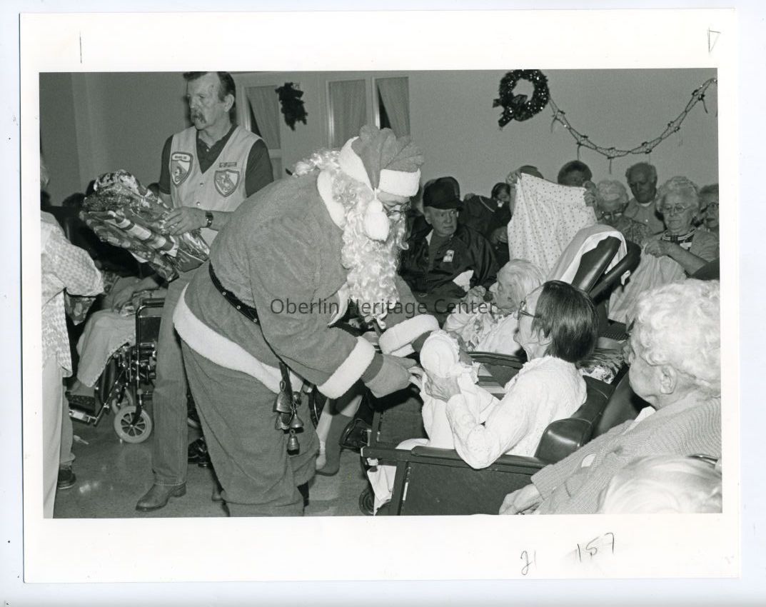 One black and white photographic print of Santa Claus distributing gifts at a nursing homes. He hands a doll to a woman. Other patients sit around and behind her.Photograph Details