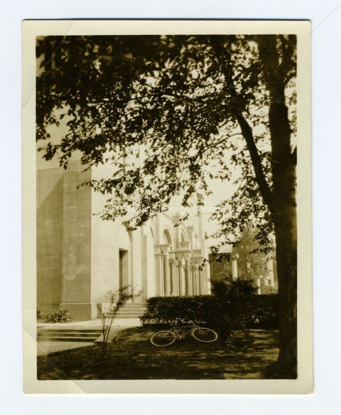 One black and white photographic print of a side angle view of the facade of Finney Chapel as seen from the lawn in front of Cox. A bicycle is lying on the ground in the foreground.Photograph Details