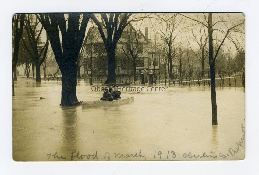 One black and white photographic postcard of the March 1913 Oberlin Flood on South Professor Street. Two people sit in a canoe in the water. A house stands in the background. A woman watches the canoe from beyond the water. The back of the postcard is blank.Photograph Details