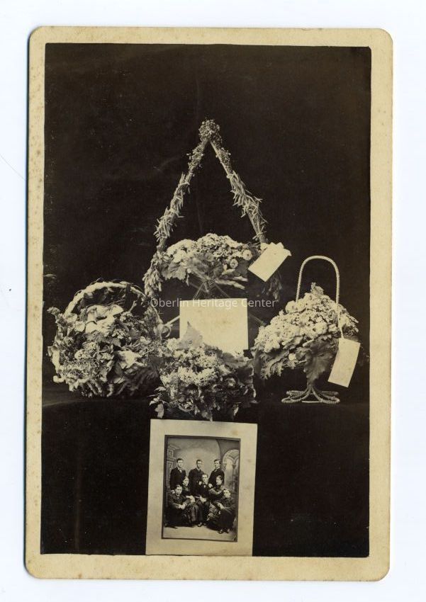 One black and white photographic print of four flower arrangements positioned above a photo of the Oberlin College graduation group from the Preparatory Department of 1881. The back of the photo shows the watermark for the photographer.Photograph Details