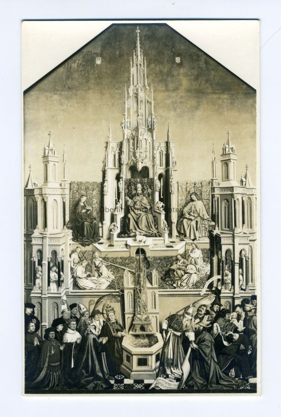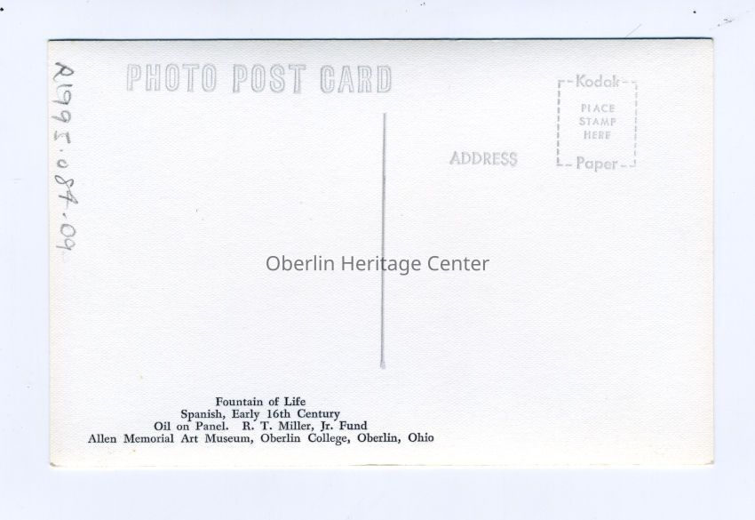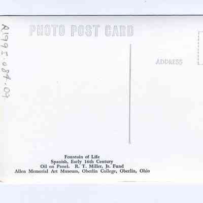 One black and white photographic postcard of the "Fountain of Life" oil on panel painting in the Allen Art Museum. The back of the postcard reads: "Fountain of Life. Spanish, Early 16th century. Oil on panel. R. T. Miller Jr. Fund. Allen Memorial Art Museum, Oberlin College, Oberlin, Ohio."Photograph Details