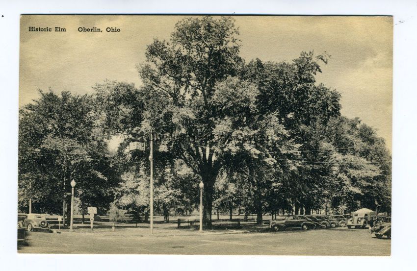One black and white photographic postcard of the 'Historic Elm' of Oberlin. Trees line both sides of the street on either side of the photograph. The back of the postcard is blank.