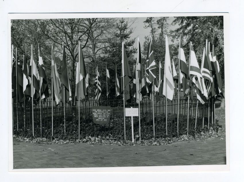 One black and white photographic print of the Historic Elm site, where a fence lined with flags stands. Two signs stand in front of the fence.Photograph Details
