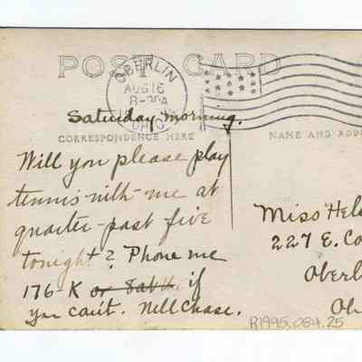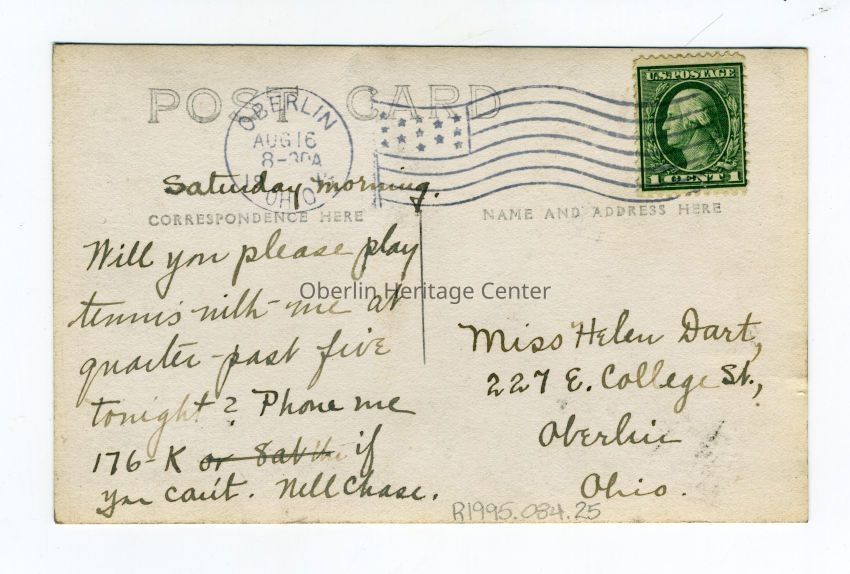 One black and white photographic postcard of the Johnson House in Oberlin. The postcard is addressed to Miss Helen Dart.Photograph Details
