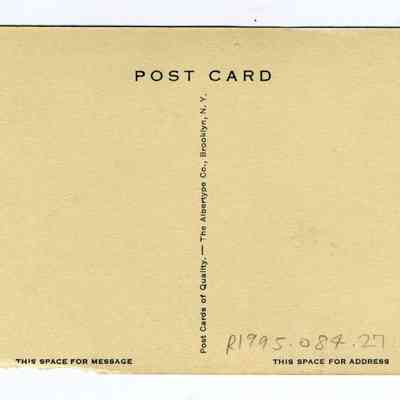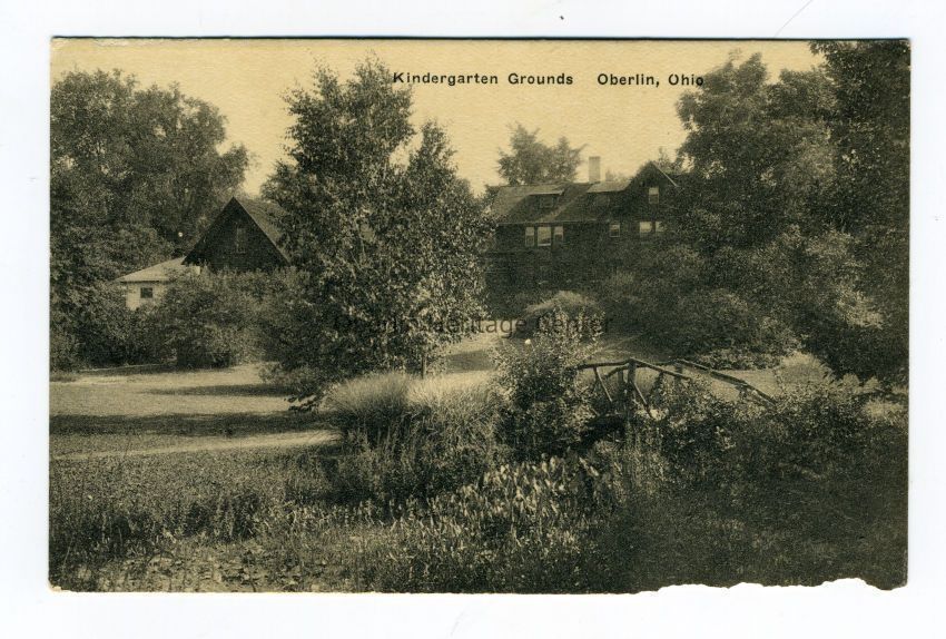 One black and white photographic postcard of the Kindergarten Grounds in Oberlin. Several buildings stand in the background. A small bridge runs over a body of water in the foreground.Photograph Details