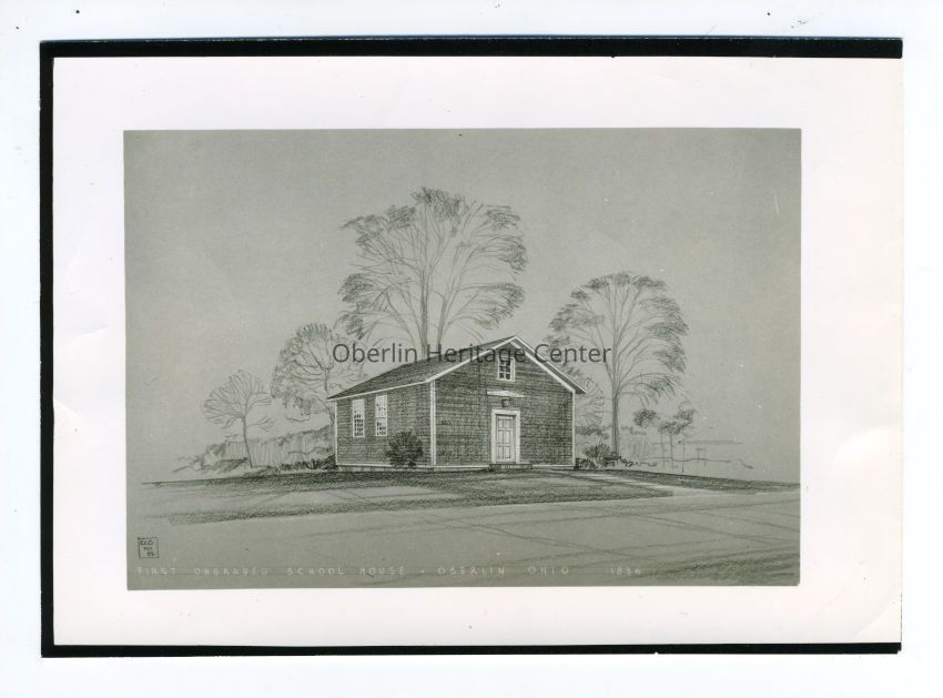 One black and white photographic print of an architect's rendition of the little red schoolhouse. A road runs across the foreground. The caption at the bottom of the drawing reads: "First Ungraded School House, Oberlin, Ohio. 1836."Photograph Details