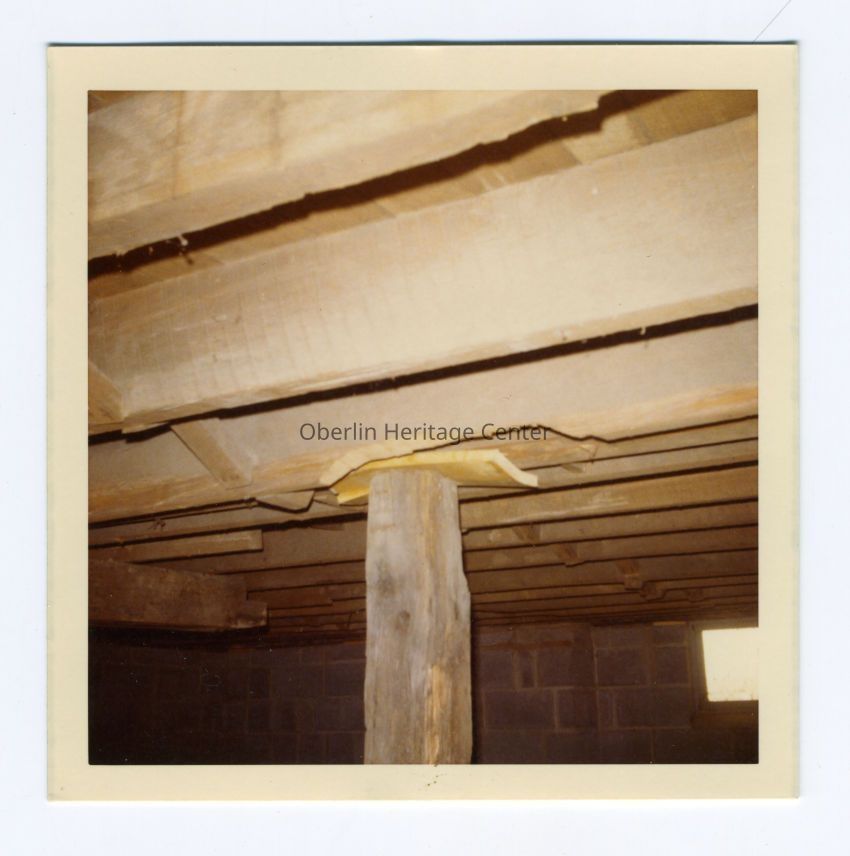 One color photographic print of the basement ceiling of the Monroe House. The top of a wooden support beam is attached to the ceiling. Part of a window can be seen at the top of the right wall.Photograph Details