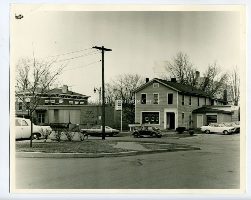 One black and white photographic print of the National Association of Book Stores and Stofan Studio building in Oberlin. Cars are parked on the street and in parking lots.Photograph Details