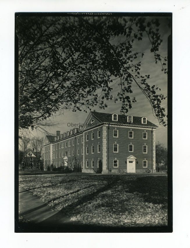 One black and white photographic print of a northward looking view of Noah Hall on the Oberlin College campus. Another building stands in the background to the left.Photograph Details