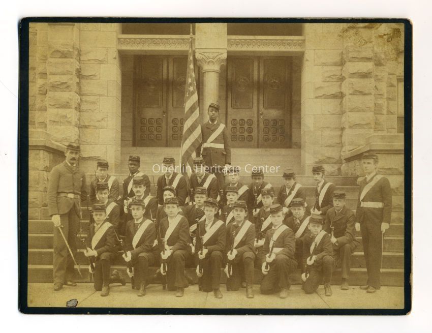 One black and white photographic print of the Oberlin Cadets posing with their rifles for the picture. Three people are standing and the rest are kneeling. They pose on the steps of a large building.Photograph Details