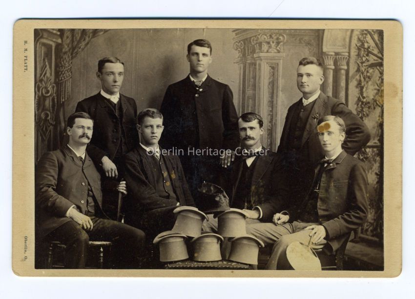 One black and white photographic print of the Oberlin College class of 1885, which consists of seven men in a formal posed portrait, with four men sitting and three men standing. A painting serves as the background.Photograph Details