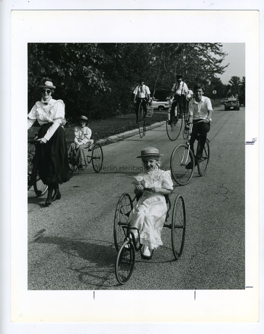 One black and white photographic print of a group of children and adults riding old bicycles during the Oberlin Sesquicentennial Parade.Photograph Details