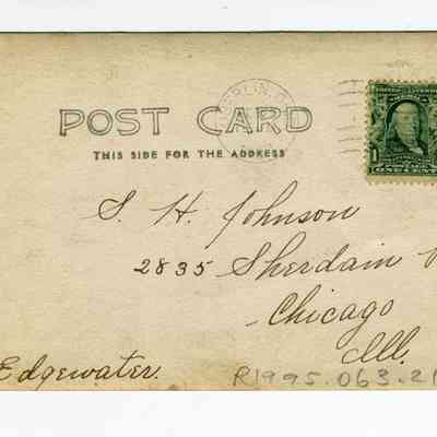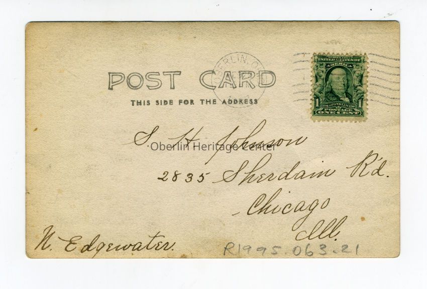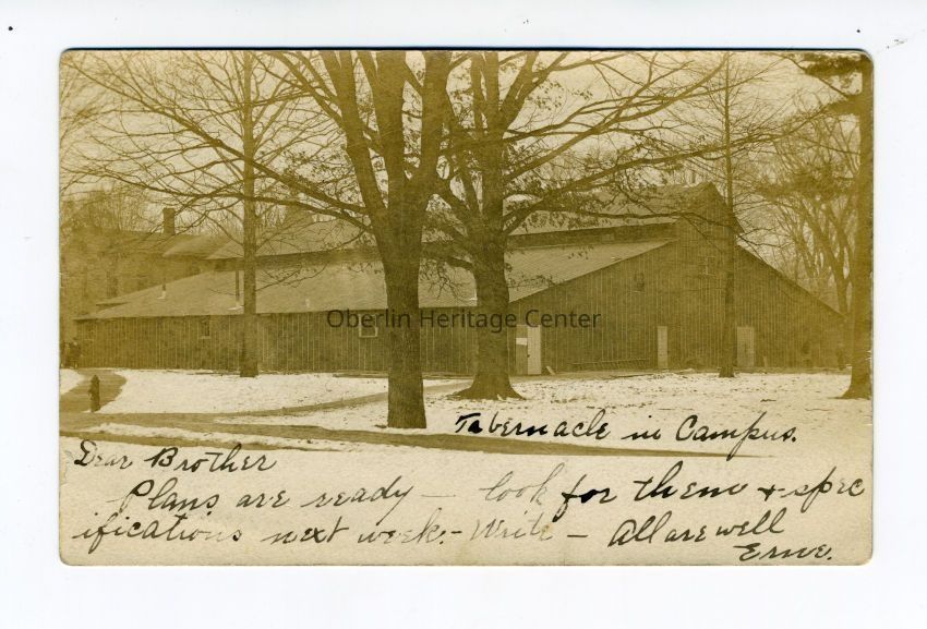 One black and white photographic postcard of the Oberlin College campus Tabernacle. The handwriting on the front of the card reads: "Tabernacle in Campus. Dear Brother, Plans are ready - look for the [?] and specifications next week. - All are well, Ernie." The postcard is addressed on the back to S. H. Johnson of Chicago, Illinois.Photograph Details