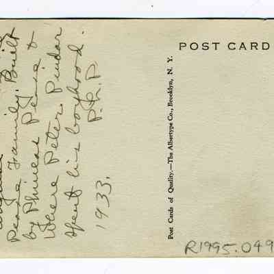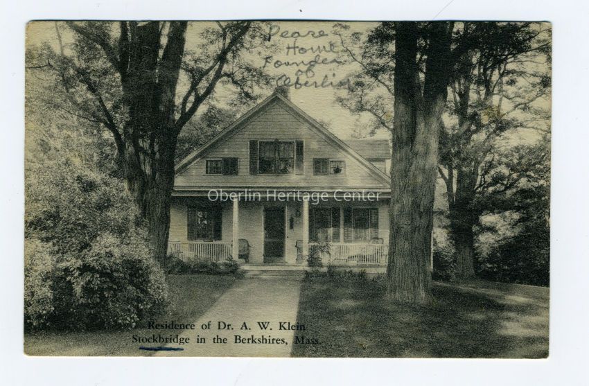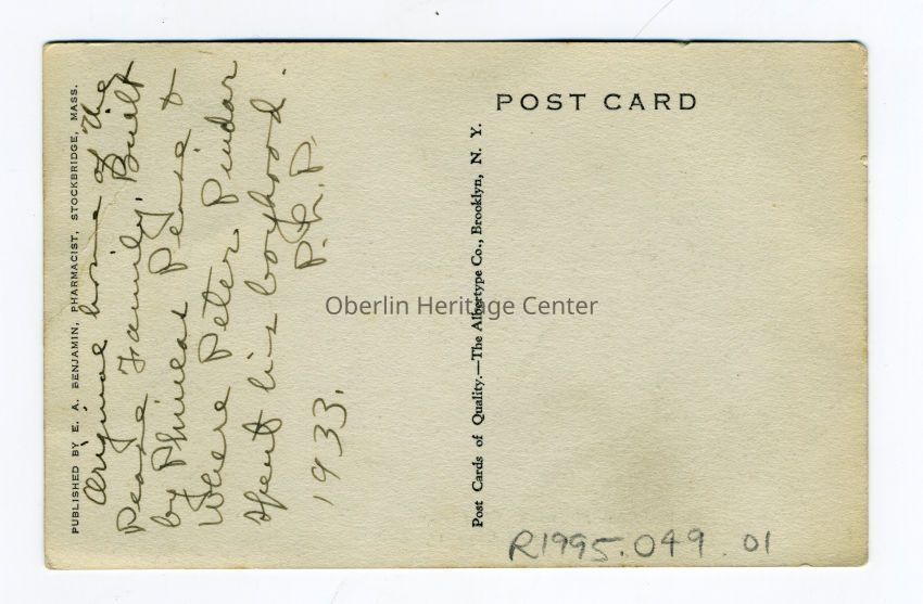 One black and white photographic postcard of the Pease (a founder of Oberlin) house in Stockbridge in the Berkshires, Massachusetts. There is handwriting on the front of the postcard that reads: "Pease House Founder of Oberlin." The photo is captioned at the bottom and reads: "Residence of Dr. A.W. Klein. Stockbridge in the Berkshires, Mass." The back of the postcard reads: "Original house of the Pease family. Built by Phineas Pease and where Peter Pindar spent his boyhood. 1933. P.h.P."Photograph Details