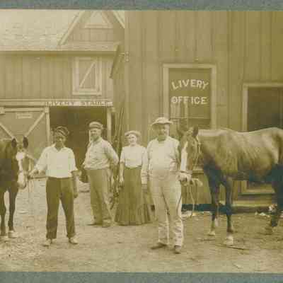 Black and white photograph of an older man and a young African American boy holding the reigns of two horses. Behind them stand two other people, a woman and a man. The men all wear hats with lighter shirts and long pants. The woman wears a long skirt. Behind them is the Livery Stable and Office. There are trees behind the Livery Stable. A hand written note on the front of the picture reads “John Broadwell, Dels father, Ruby Broadwell and J. Dels sister”Photograph Details