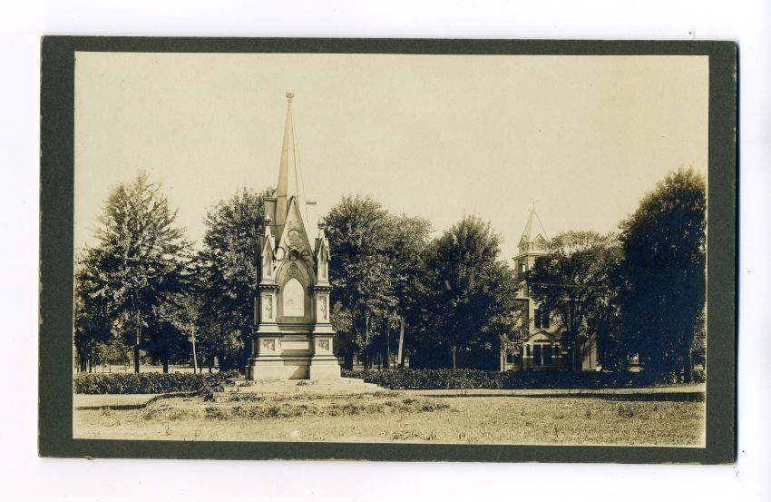 One black and white photographic print of the Soldiers' Monument with the College Chapel in the background to the right, in Oberlin.Photograph Details