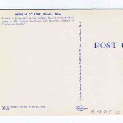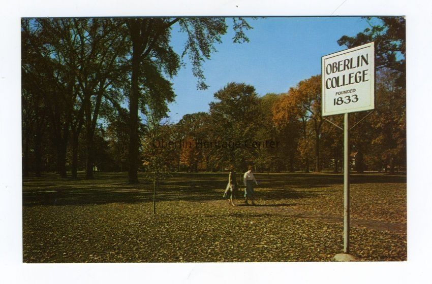 One color photographic postcard of Tappan Square in Oberlin. Two people can be seen walking on a trail and an Oberlin College sign stands to the right. The back of the postcard reads: "A view looking west across Tappan Square around which many of the college buildings and business section of Oberlin are located."Photograph Details