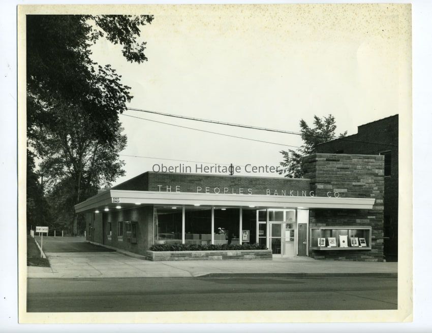 One black and white photographic print of The Peoples Banking Co. in Oberlin. South Main Street runs along the foreground.Photograph Details
