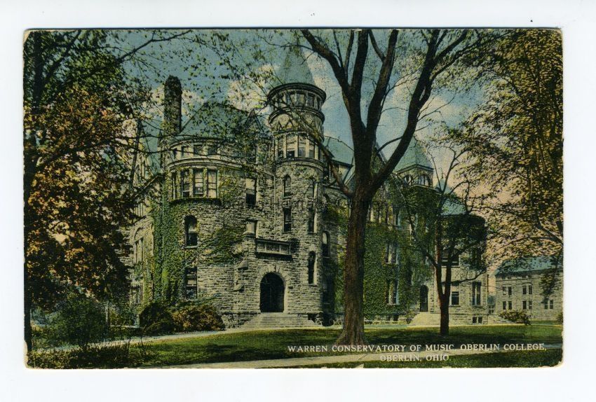 One color photographic print of the Warner Conservatory of Music building on the Oberlin College campus. The back of the postcard is blank.