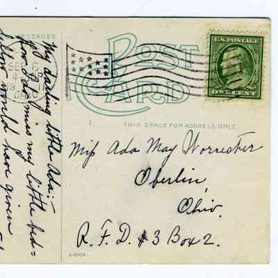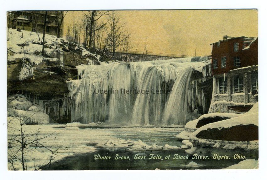 One color photographic postcard of a winter scene of the East Falls of Black River in Elyria. The falls have frozen over and most of the scene is covered in show. A building stands to the right of the falls and another stands on top of the cliffside to the left of the falls. The back of the postcard reads: "My darling little Ada - How I do miss my little bedfellow would have given anything if I could have taken you bye bye with me when I [?] again I will take both my girls down town. x x x x x x x x Aunt Emma"Photograph Details