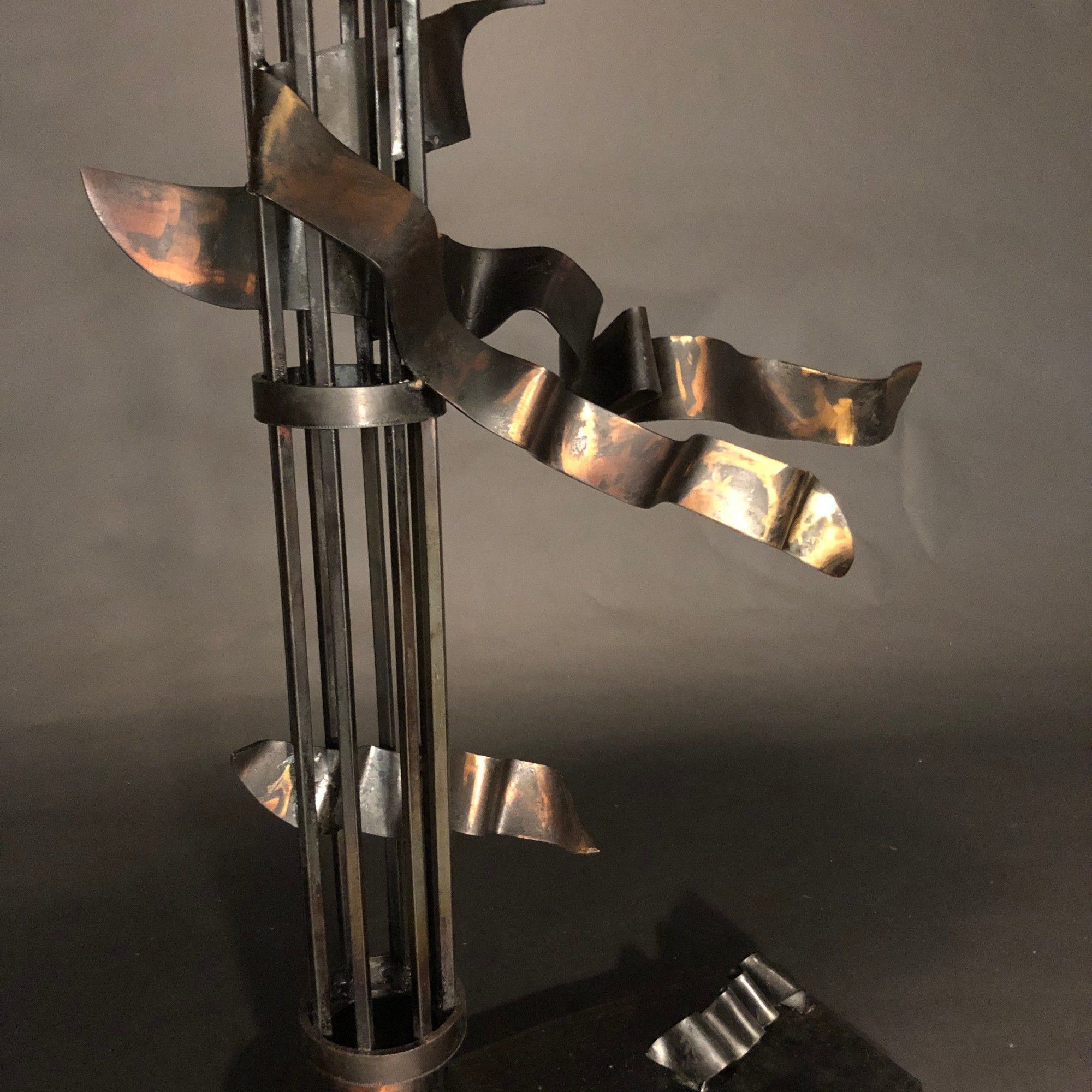 Curly white oak, raw linseed oil, carnauba wax, mild steel
