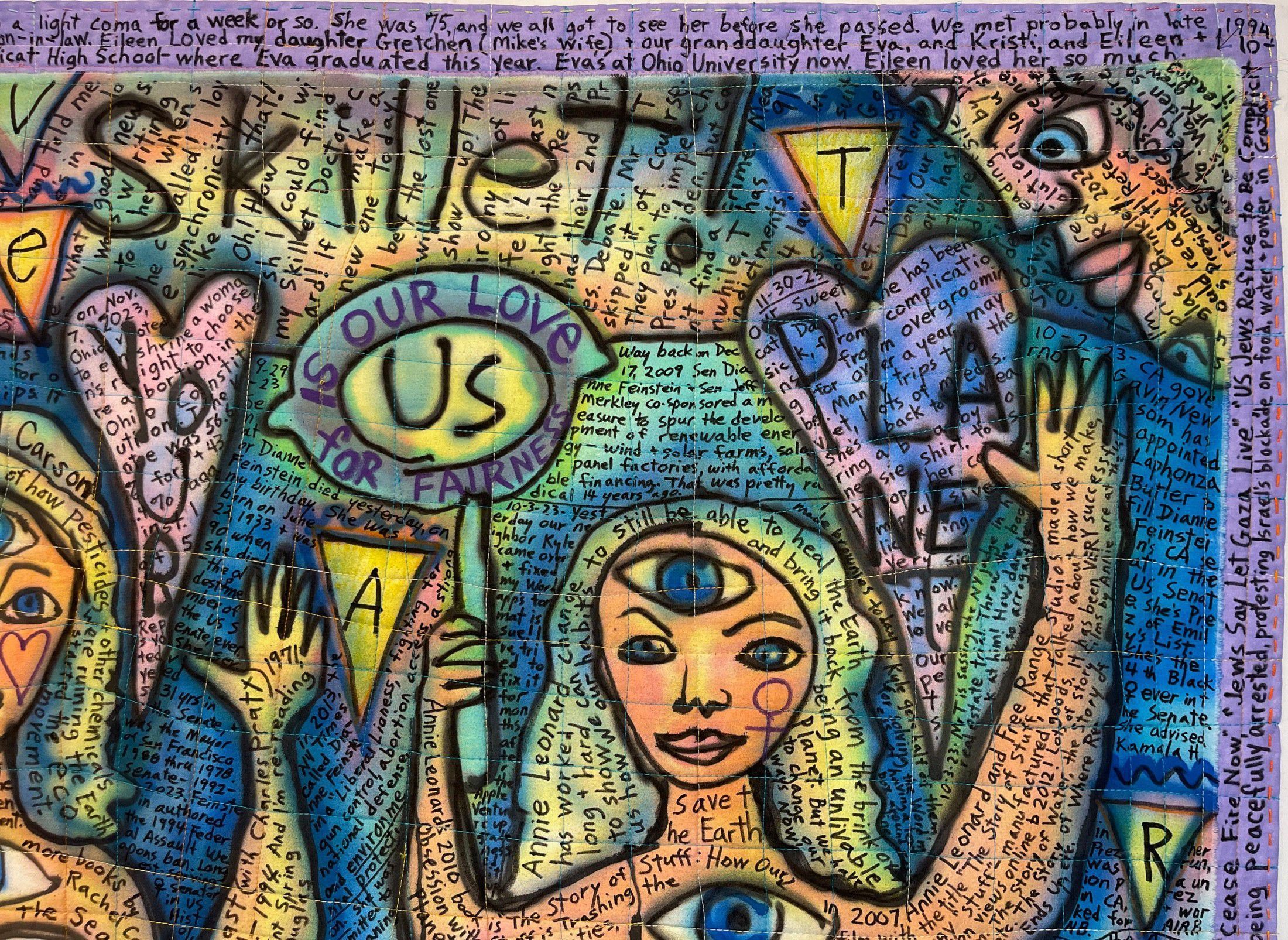 White cotton, cotton machine thread, hand-dyed perle cotton embroidery thread, airbrush paint, paint markers, one Green Temple Buddha Boy bead, bamboo and organic cotton batting, handmade batiks