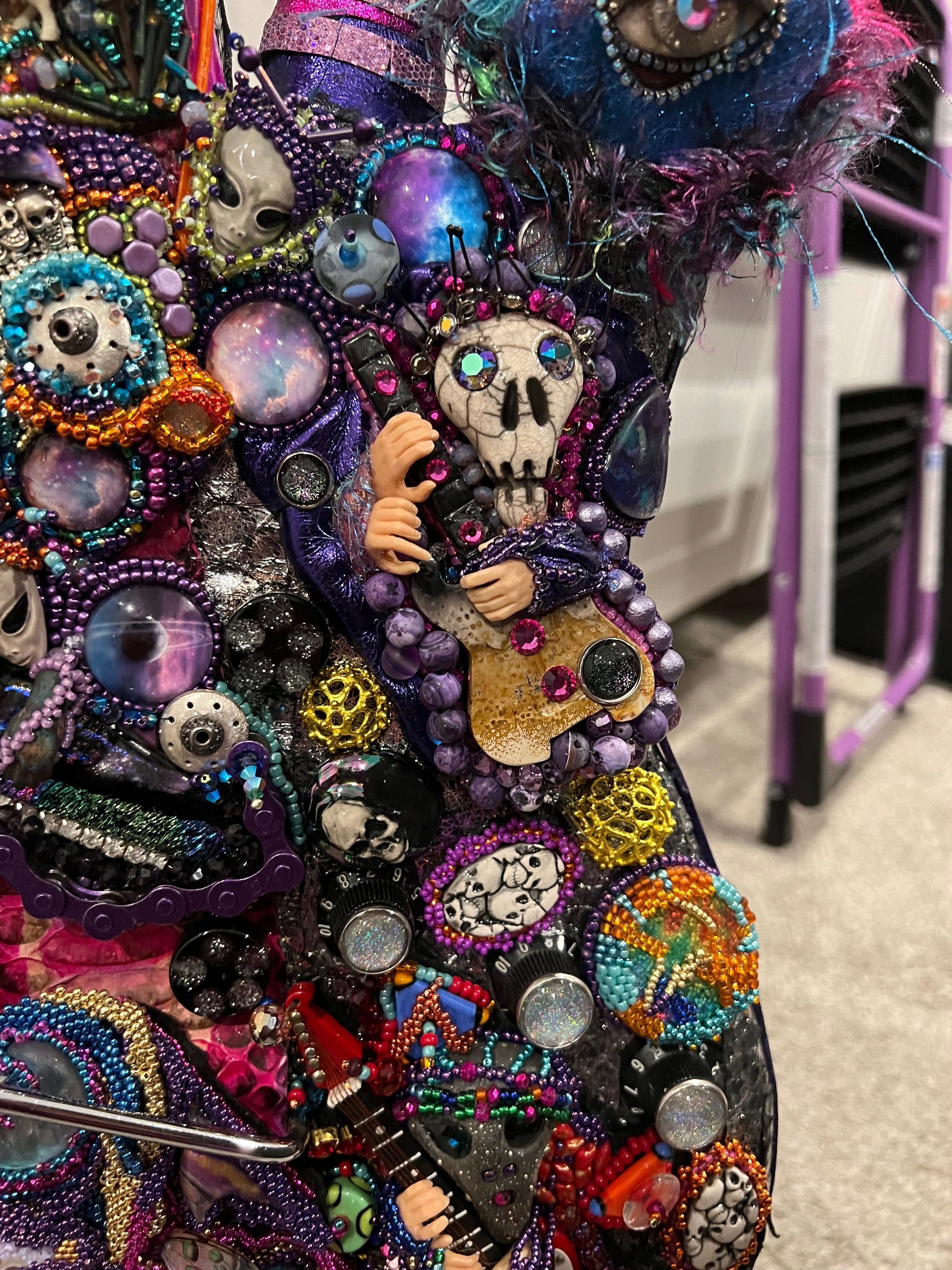 Electric guitar, leather, seed beads, metals, polymer clay, resin, cloths, fibers, rubber, bronze, crystals, glass, guitar stand
