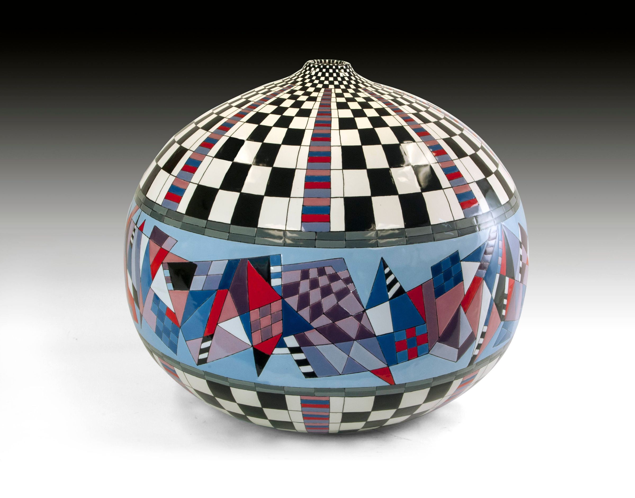 The image depicts a highly intricate spherical sculpture, predominantly featuring a mesmerizing pattern of checkered black and white squares at the top, transitioning to vibrant triangles and rectangular shapes in shades of blue, red, and purple, creating a stunning visual contrast and 3D illusion on a smooth, reflective surface.