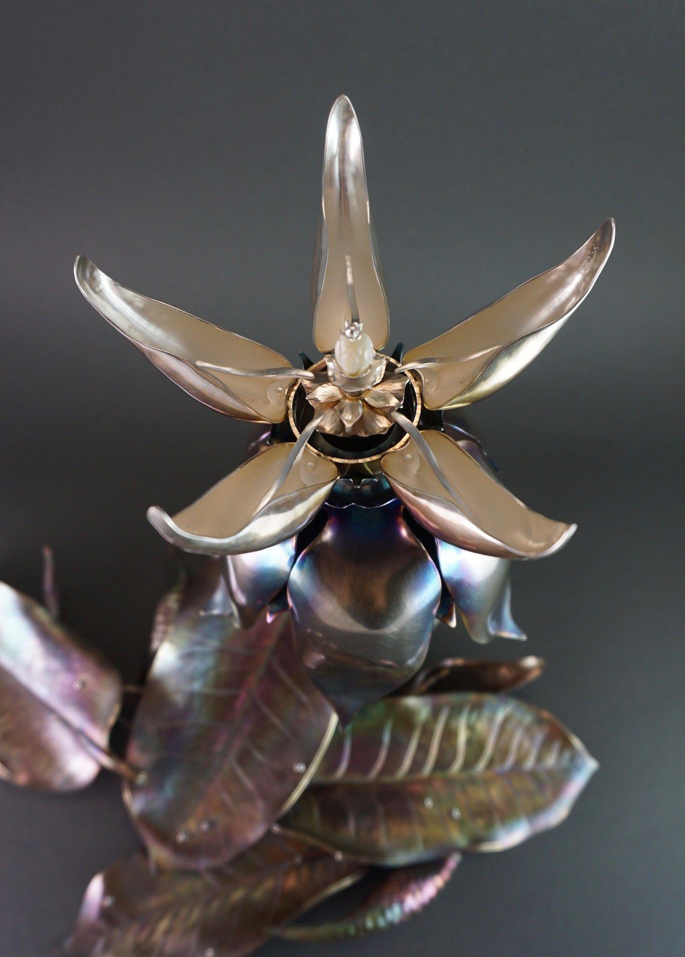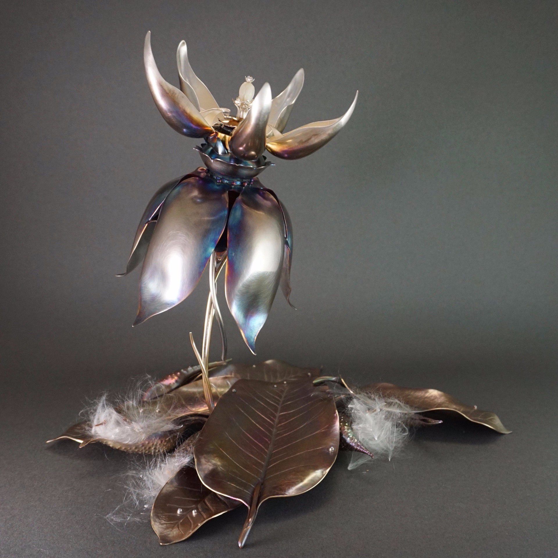Sterling silver, red brass, bronze, freshwater pearls, mother of pearl, glass lens, grain of sand, milkweed seeds
