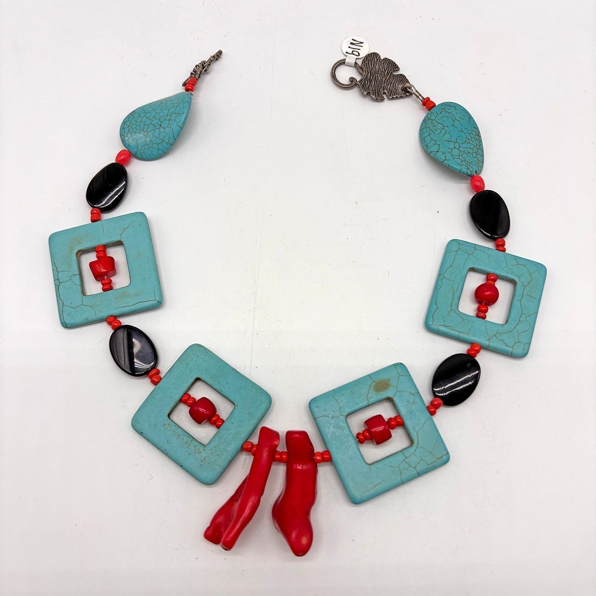 E19: Red Coral, Turquoise, Black Bead Necklace
