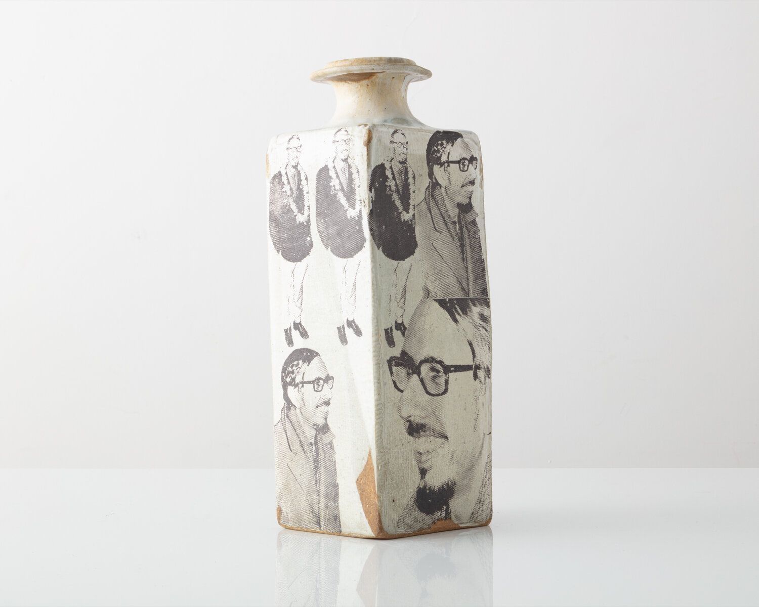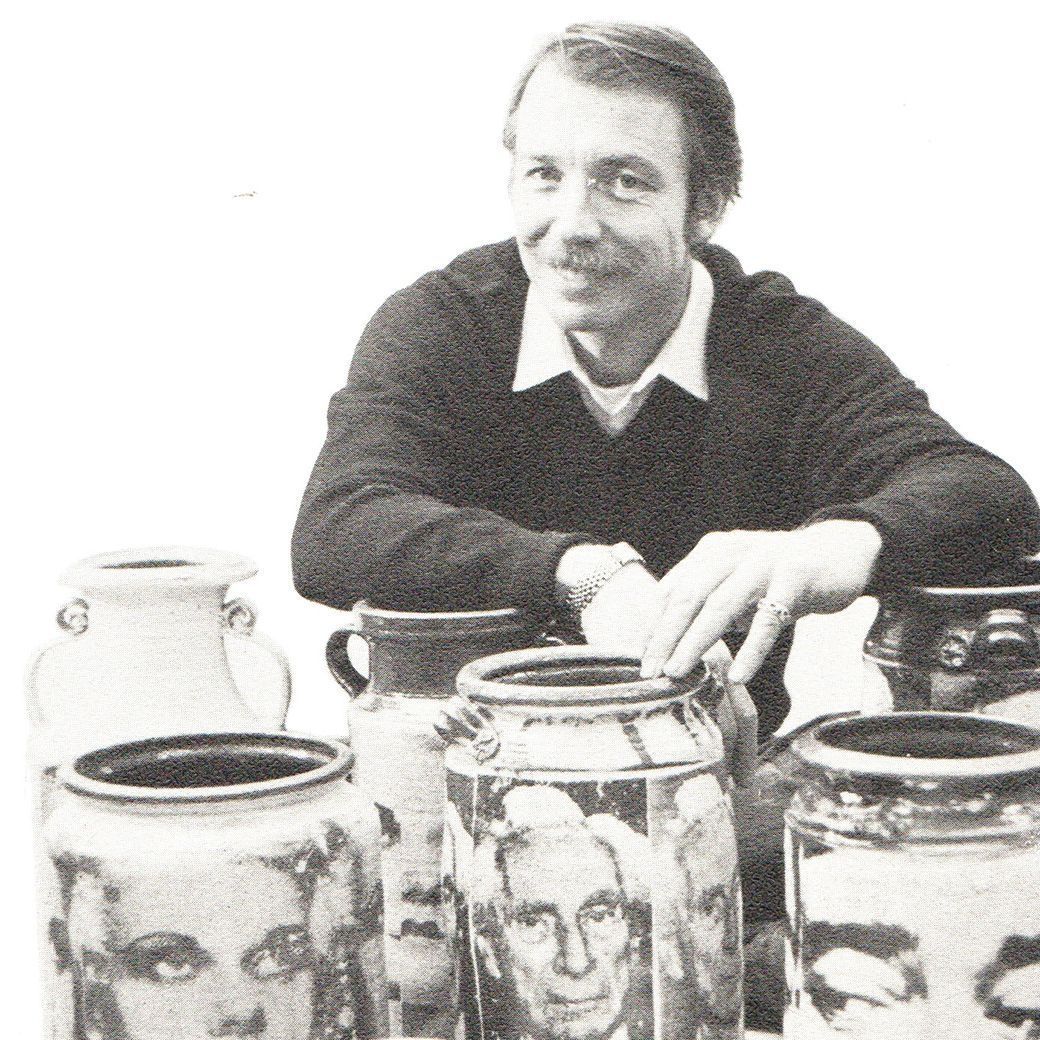 Robert Engle is known for developing screen printing and decal work in a noncommercial studio on stoneware vessels. While Engle began his career as a more traditional potter, his iconic pots often feature screen-printed photographs, mostly of celebrities, on his pots.