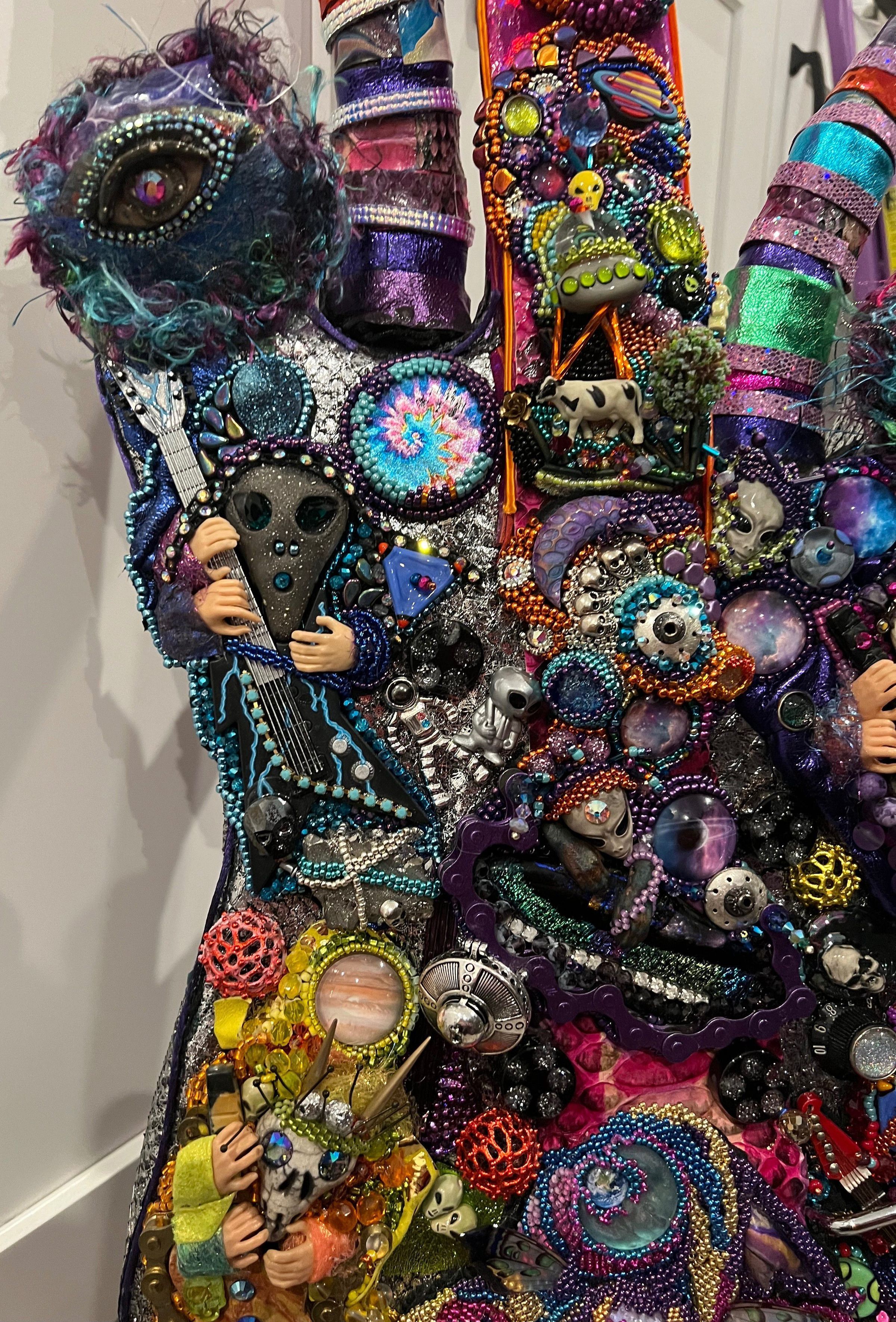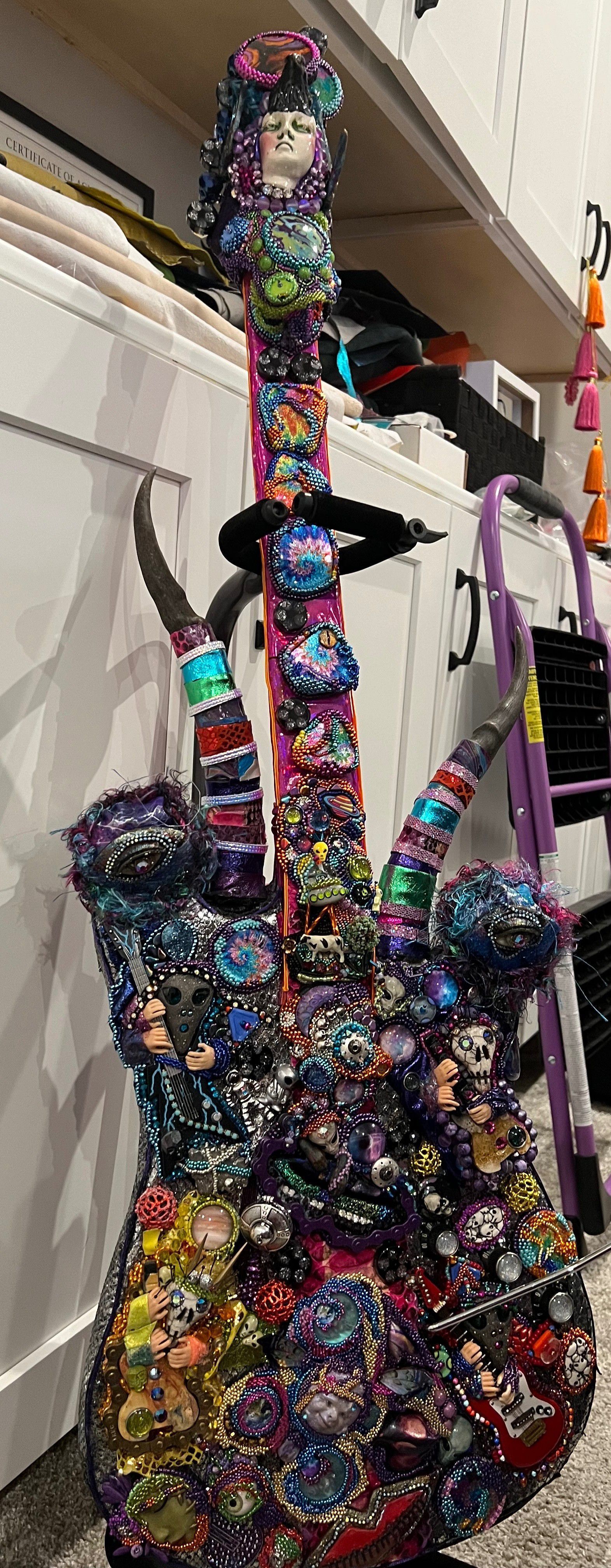 Electric guitar, leather, seed beads, metals, polymer clay, resin, cloths, fibers, rubber, bronze, crystals, glass, guitar stand