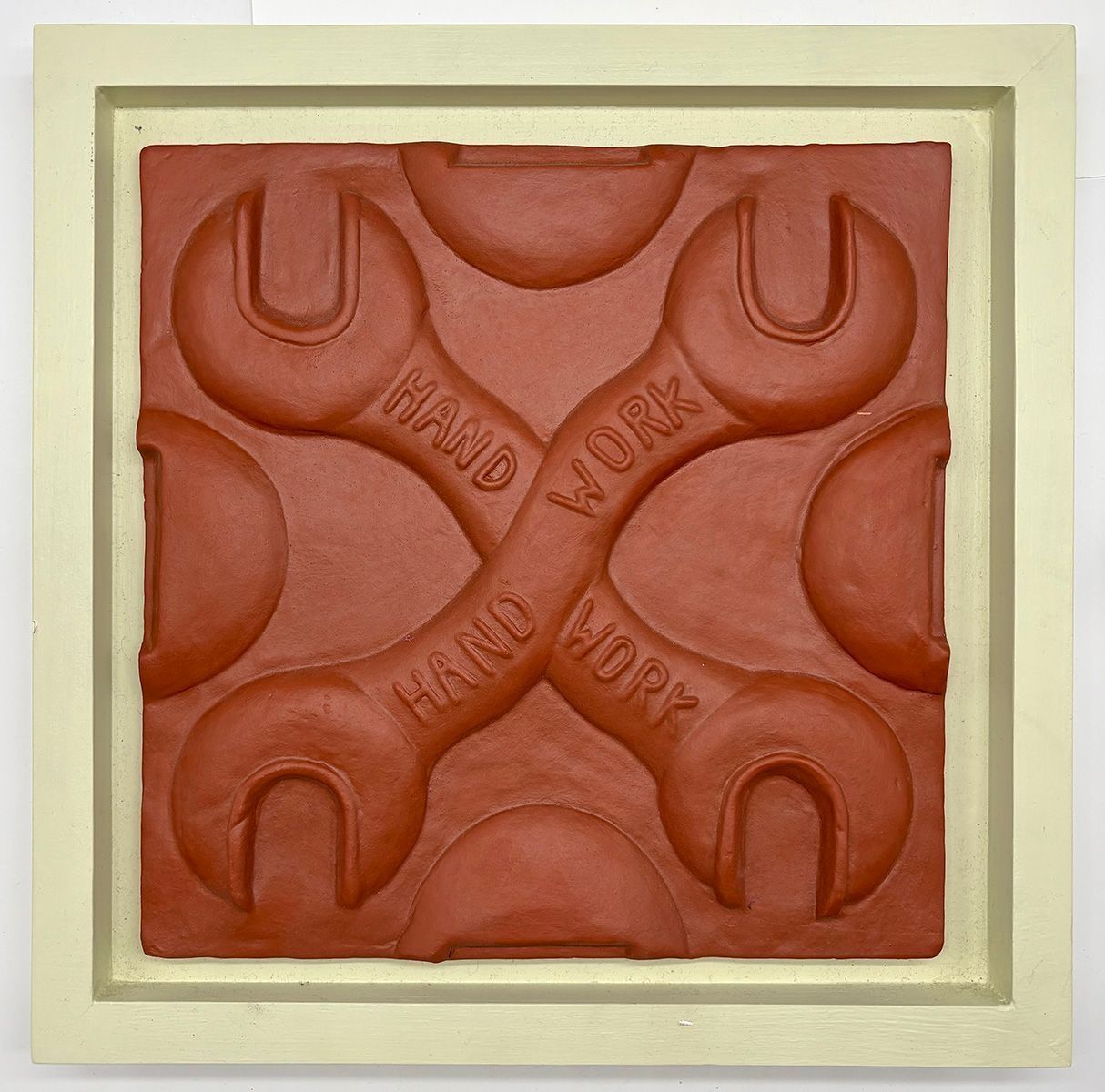 A terra-cotta colored clay tile with a white frame surrounding it. The tile features 2 wrenches crossed in an X formation with “Hand work” on both.Acquisition