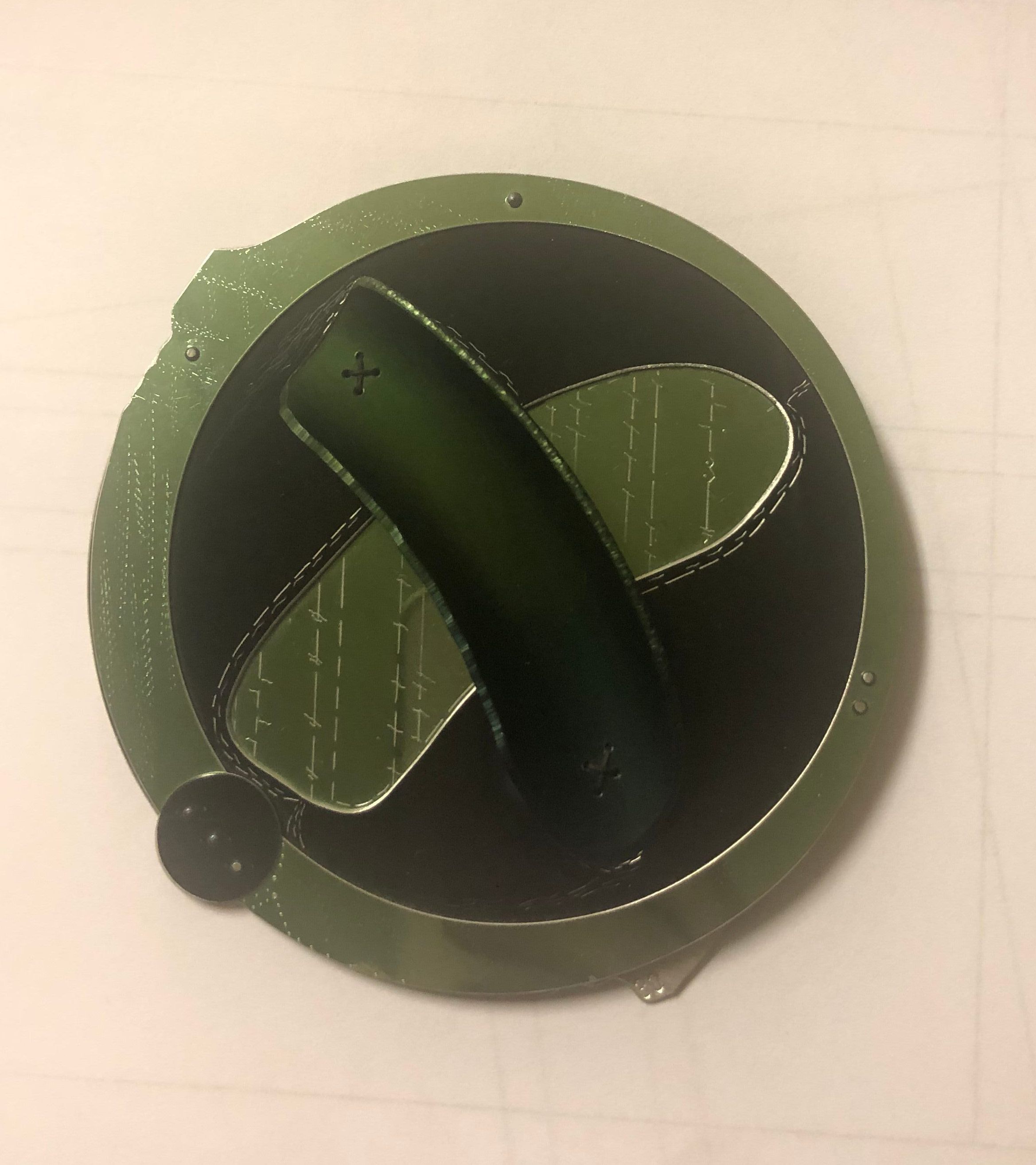 Circular green and black brooch with a green 'X' in the centerAcquisition