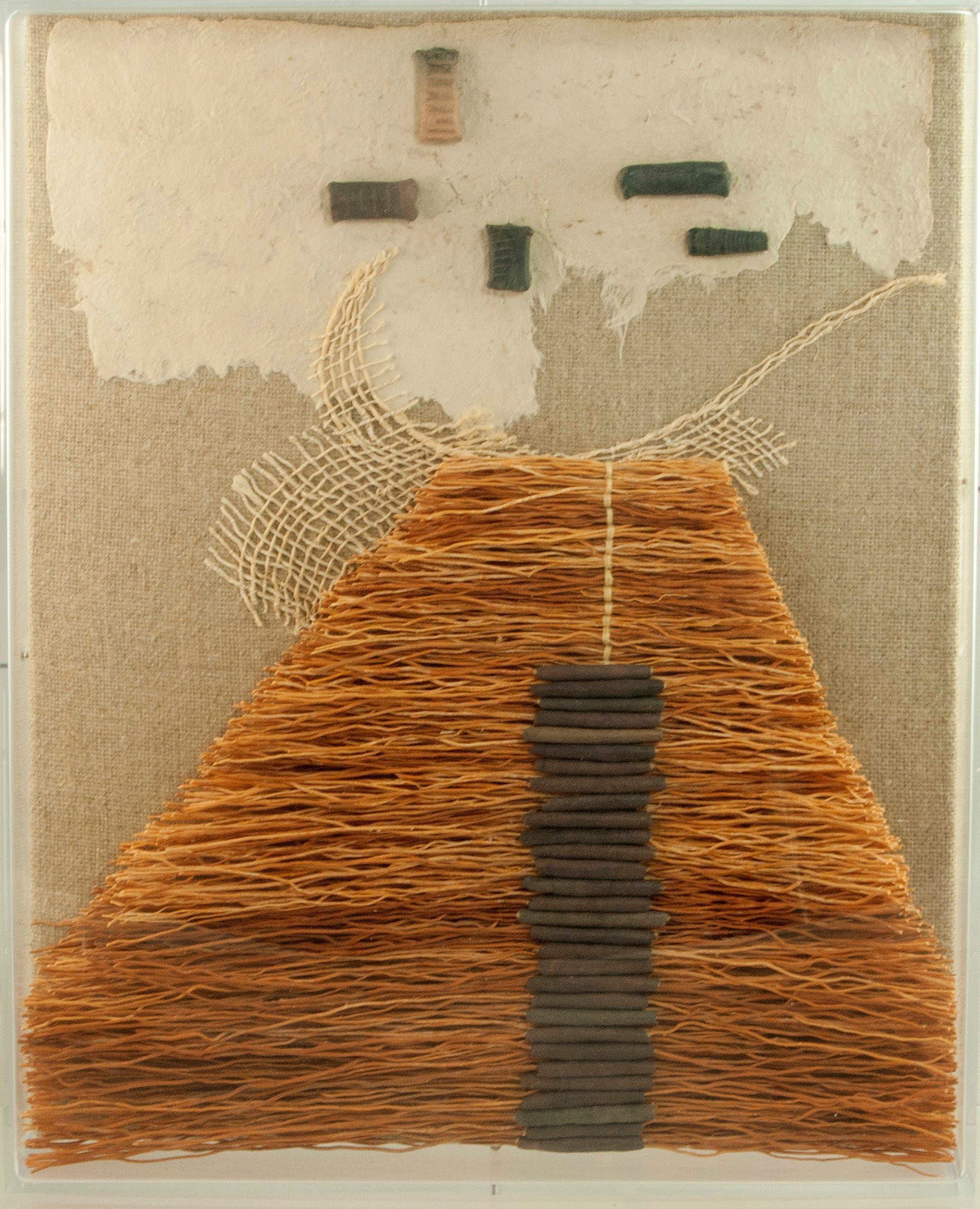 Couching embroidery, clay, ixtle, amate, zacatan root, linen, lucite enclosure