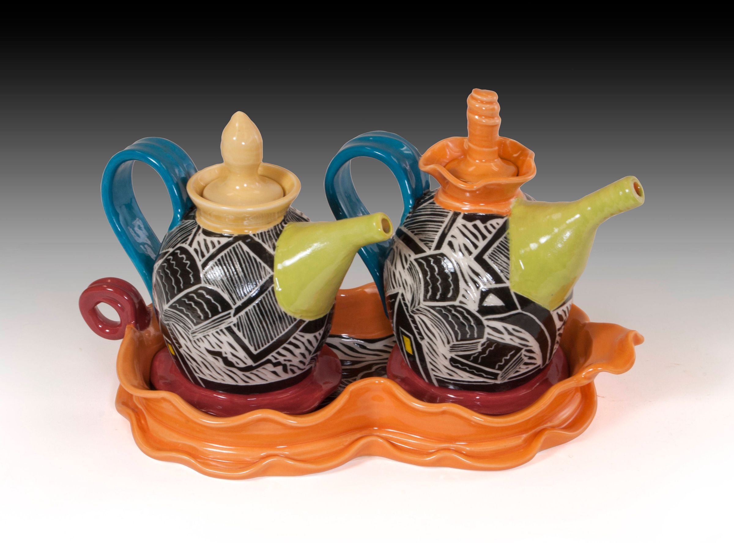 Two Pouring Vessels on Yellow Scalloped Tray