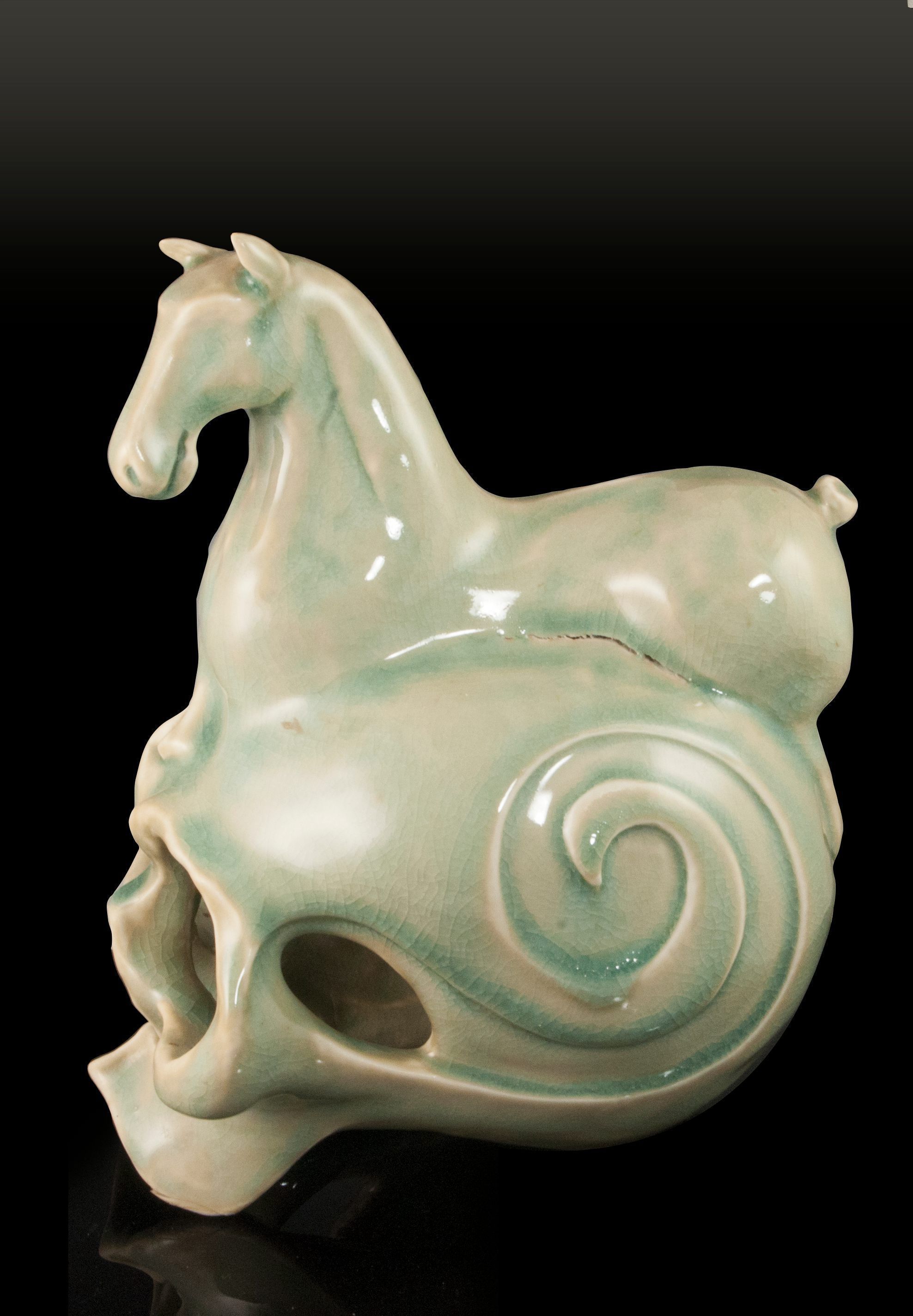 Porcelain sculpture with celadon glaze of a skull with a horse