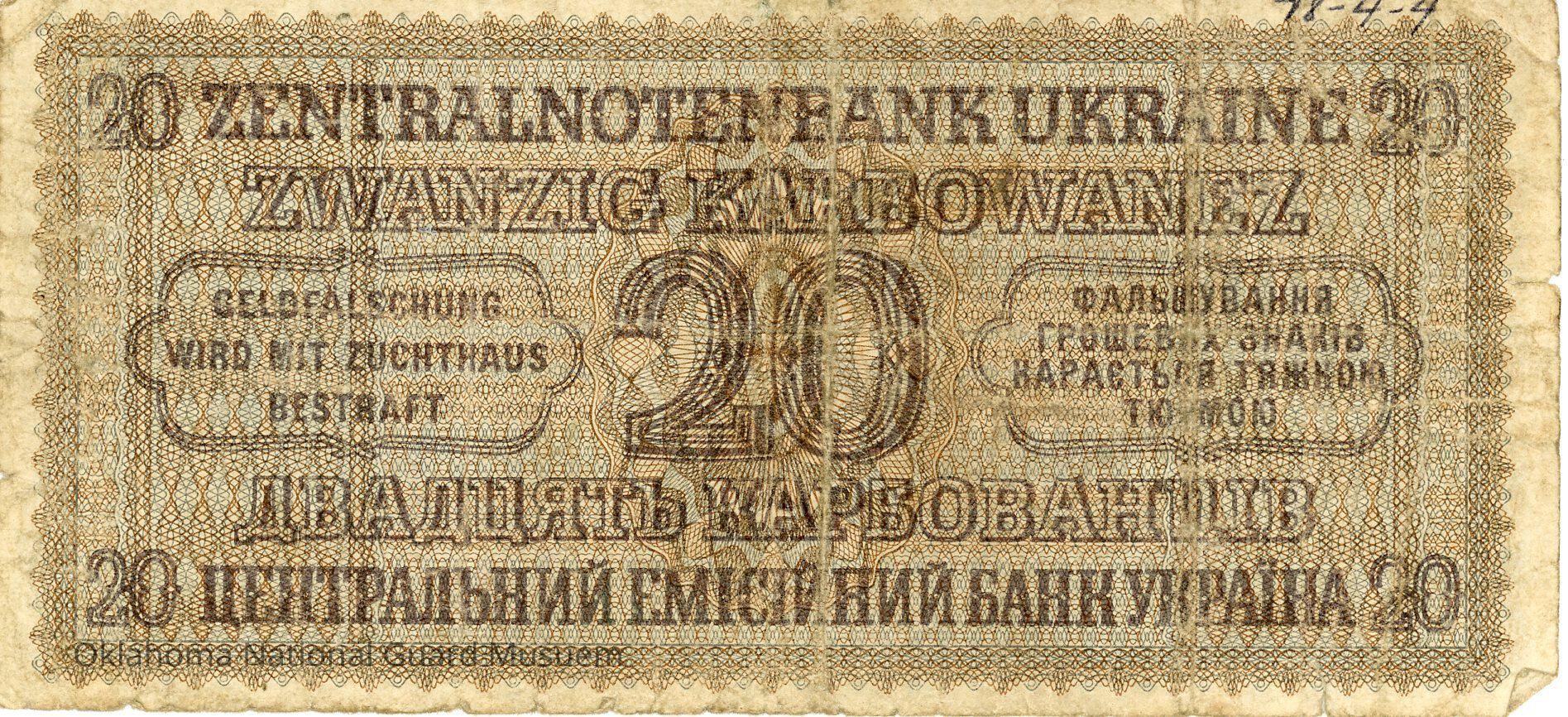On the ornamented background of figure '20' there is denomination on German: ZWANZIG KARBOWANEZ is marked in letters. Beneath there is the text: Ausgegeben auf Grund der Verordnung vom 5. März 1942 / ROWNO, den 10. März 1942. ZENTRALNOTENBANK UKRAINE, under it there is the signature of director of Central Bank, to the right of signature there is stamping looks like the coat of arms of German Empire (the eagle with the open wings holds in paws a wreath from oak leaves with a swastika) and circular inscription: ZENTRALNOTENBANK UKRAINE. In four corners of note there is the denomination '20', at the left there is vertical denomination: ZWANZIG. To the right there is portrait of industrial worker in so called 'mandala' (sacral decorative vignette), beneath it there is series number, 6 digit serial, red color. Background colors are brown and grey, print color is violet-black.Transcription