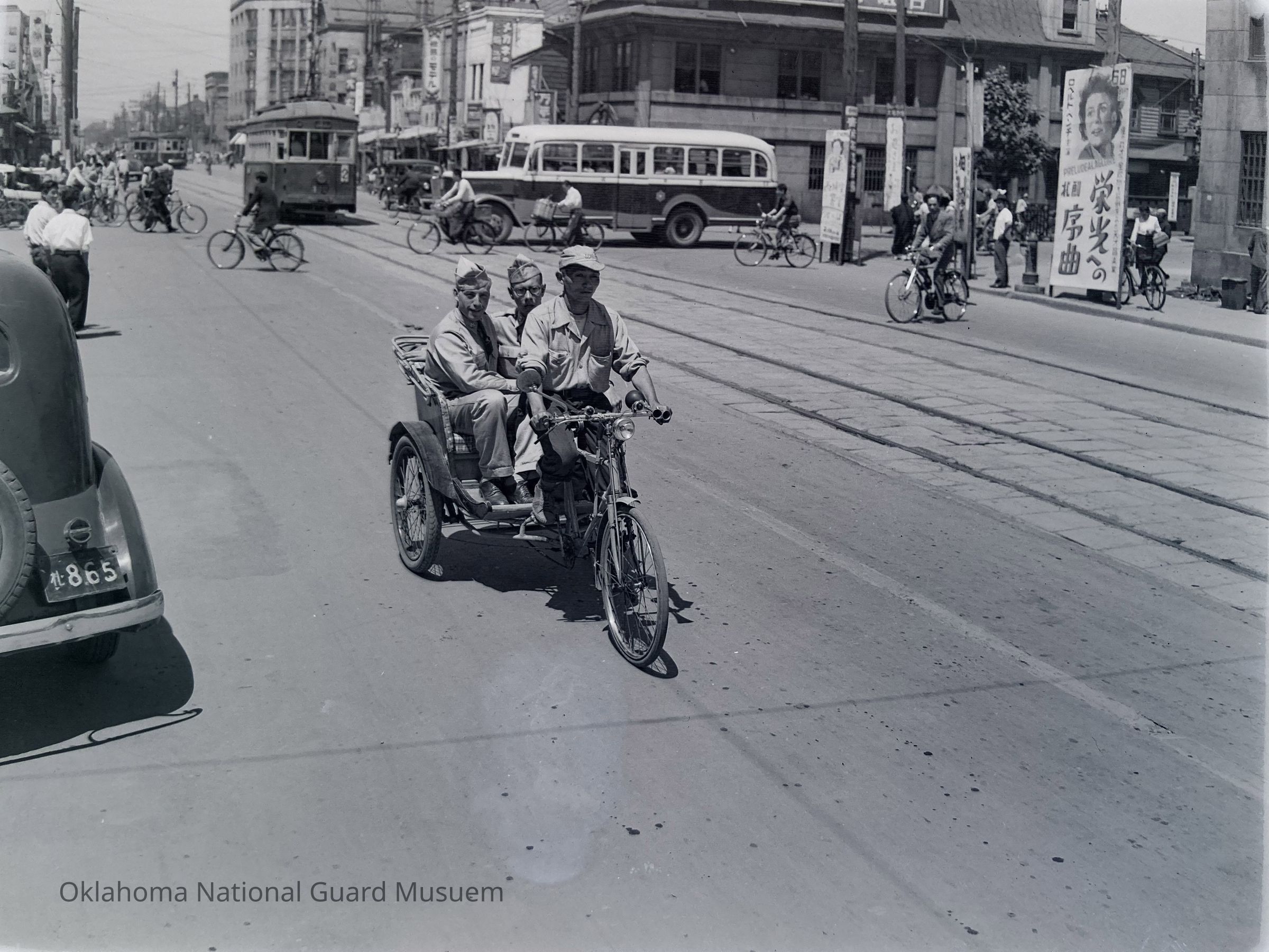 Negative of two soldiers in a pedal cab in Sapporo on Hokkaido, Japan