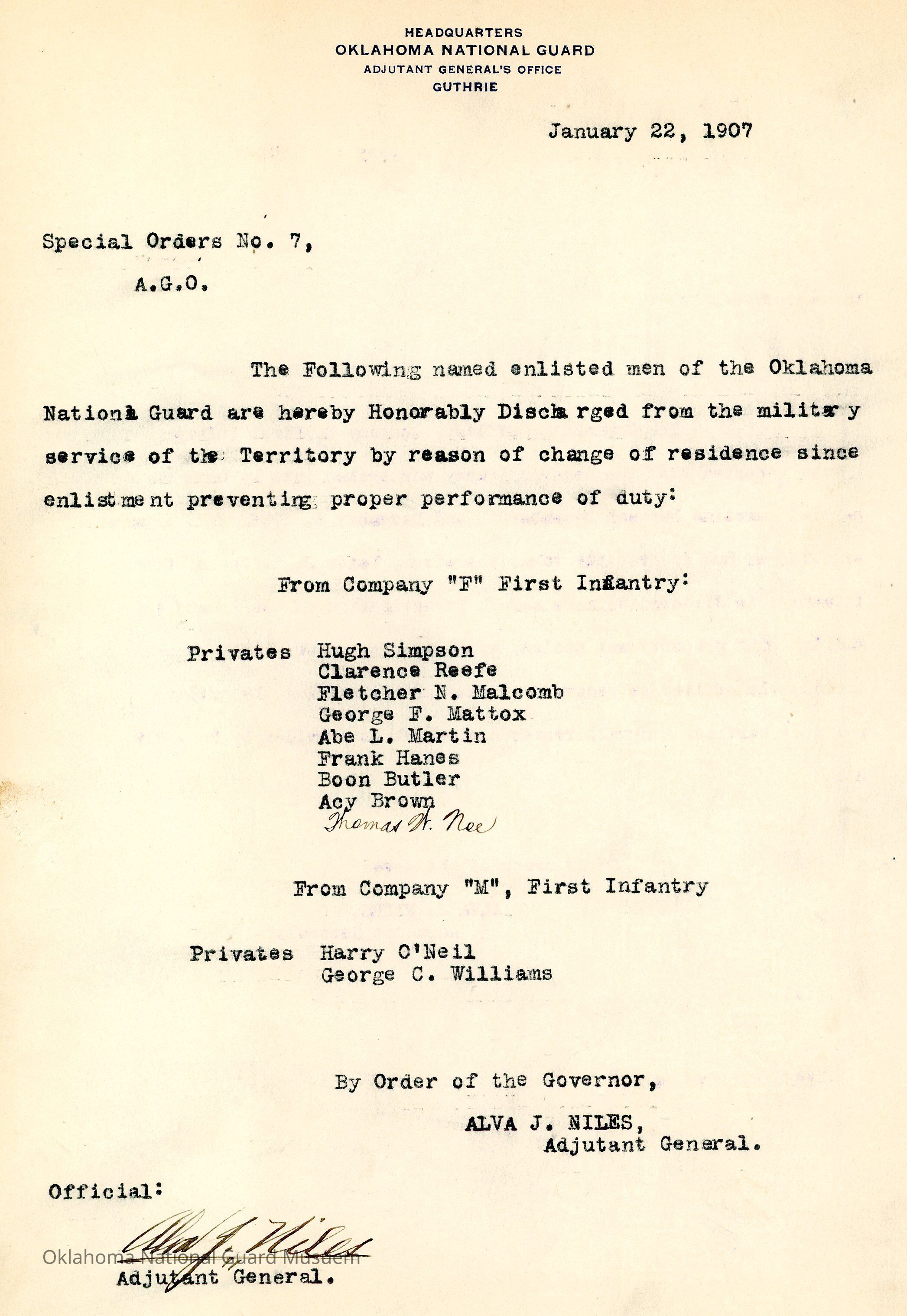 Special Order #7 from Headquarters Adjutant General's Office in Guthrie. The order lists the honorable discharges in Company F and Company M First InfantryDate(s) of Creation